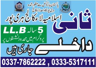 Sani Islamia Law College Bachelor of Law LLB admissions 2024 has been started. Students can enroll for admissions in Sani Islamia Law College Haripur Khyber Pakhtunkhwa KPK Pakistan for academic year 2024 to continue campus based or online education in Law College. Eligible students for fulfilling criteria for admissions in LLb can enroll as per Private admission policy 2024 till closing date 18 March 2024. Read newspaper ad for exact details.