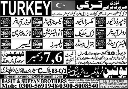 Vacant posts including truck mechanic, tyre repairman, welder, loader operator, general welder, dumper driver, labor, eletctric welder, plumber, excavator operator, auto electrician, roller operator and mixer driver are announced in Union Trade Test and Training Center Istanbul, ankara Turkey as per 4 December 2025 advertisement in daily Express Newspaper. Educational qualifications required DAE, Bachelor, Intermediate and Matric etc.