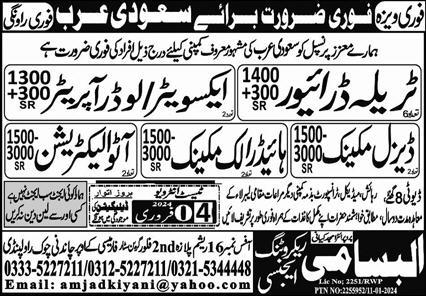 Al Basami Recruitment Agency jobs advertisement dated about 1 February 2024 in daily Express Newspaper invites application for the vacant post of excavator operator, driver, diesel mechanic, hydraulic mechanic, loader operator, auto electrician and traila driver in Dammam, makkah Saudi Arabia. Preferred Education is Matric, Intermediate, DAE, B.E and Bachelor etc.