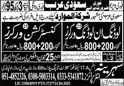Sehreena Trade Test and Training Center Dammam, tabuk Saudi Arabia invites applications from eligible candidates for the post of unloading worker, loading worker and construction worker as per advertisement of June 25, 2025 published in daily Express Newspaper. Educational qualifications required Matric and Middle etc.