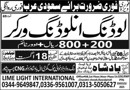 BTTC Badshah Overseas Employment Promoters jobs advertisement dated about 15 August 2025 in daily Express Newspaper invites application for the vacant post of unloading worker and loading worker in Jeddah, dammam Saudi Arabia. Persons with Intermediate and Matric etc. education can apply.