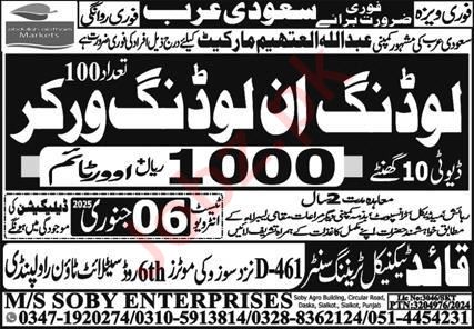 Soby Enterprises Overseas Employment Promoters jobs advertisement dated about 5 January 2025 in daily Express Newspaper invites application for the vacant post of loading unloading worker in Riyadh, riyadh Saudi Arabia. Persons with Middle etc. education can apply.