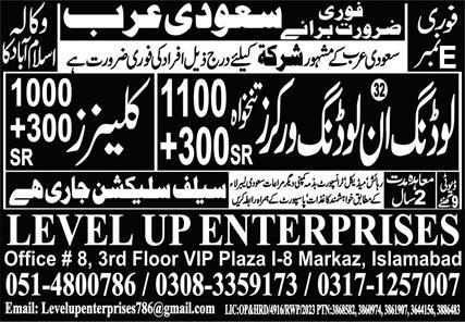 Level Up Enterprises jobs advertisement dated about 13 August 2025 in daily Express Newspaper invites application for the vacant post of cleaner, unloading worker and loading worker in Dammam, riyadh Saudi Arabia. Preferred Education is Intermediate, Matric and Middle etc.