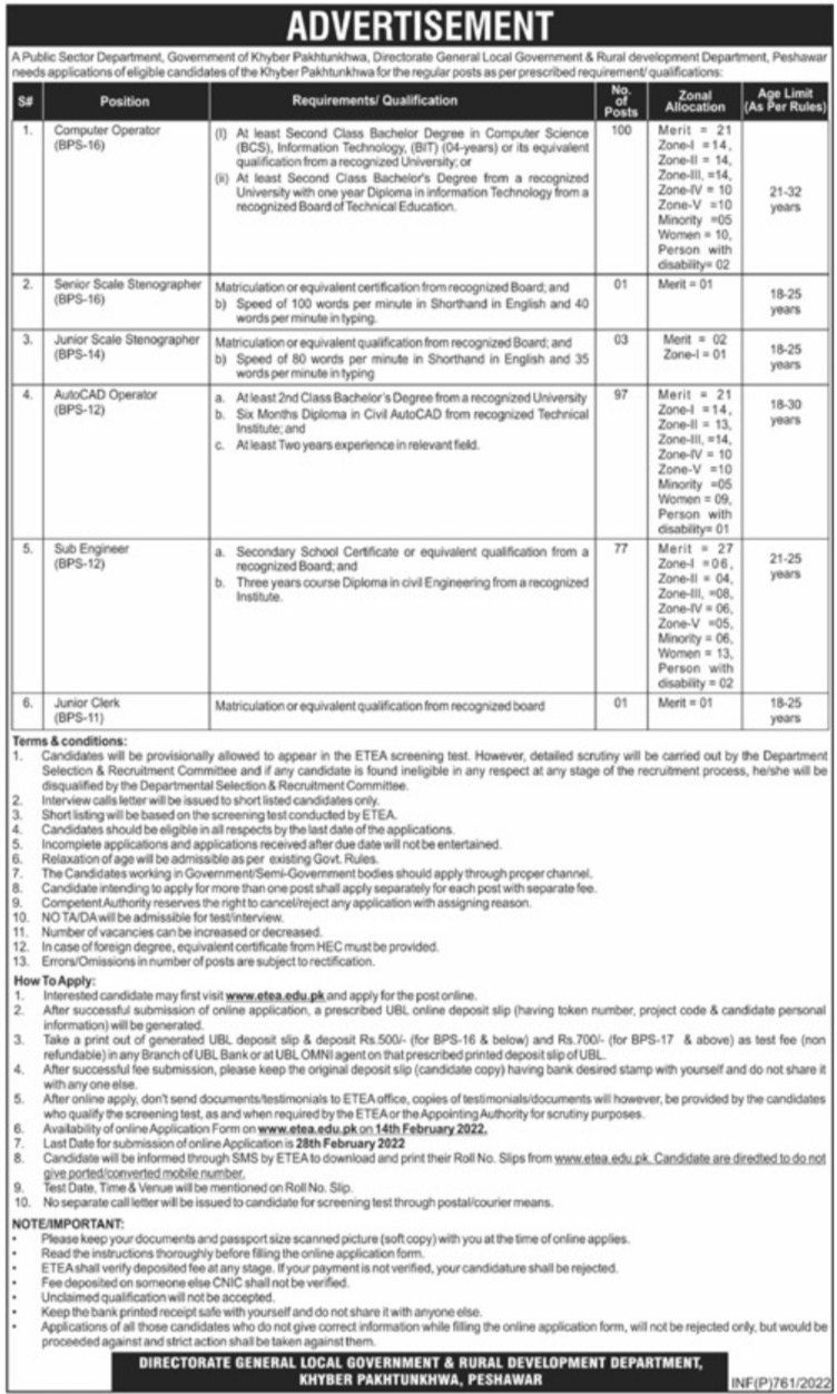 Local Government and Rural Development Department jobs advertisement dated about 7 February 2022 in daily Mashriq Newspaper invites application for the vacant post of clerk, autocad operator, sub engineer, computer operator and stenographer in Peshawar Khyber Pakhtunkhwa KPK Pakistan. Persons with Bachelor and Intermediate etc. education can apply.