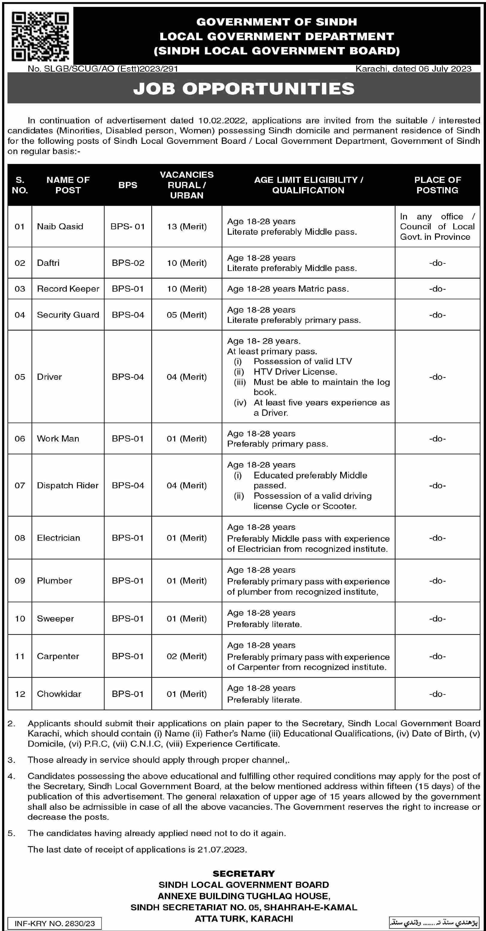 Local Government Department is looking for candidates for following posts as per job advertisement published in daily Dawn Newspaper of July 8, 2023 for location Karachi, karachi Sindh Pakistan:
