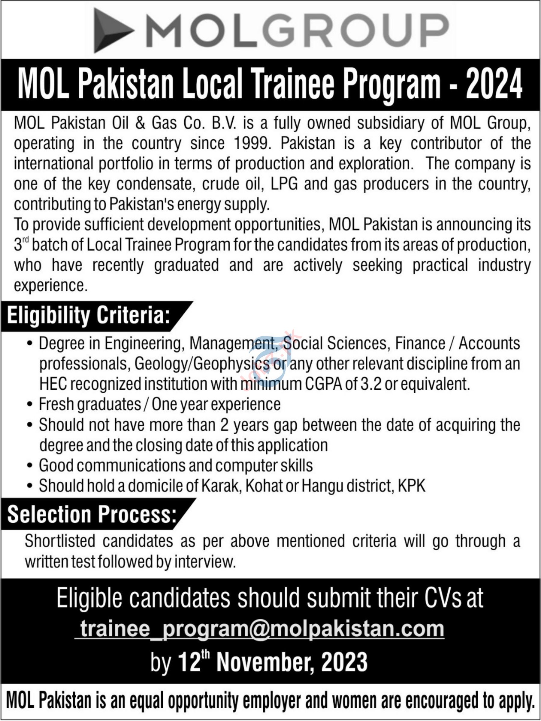MOL Group Peshawar, peshawar Khyber Pakhtunkhwa KPK Pakistan invites applications from eligible candidates for the post of local trainee program as per advertisement of November 5, 2023 published in daily Aaj Newspaper. Candidates with BBA, B.E, Bachelor and Master etc. educational background will be preferred.