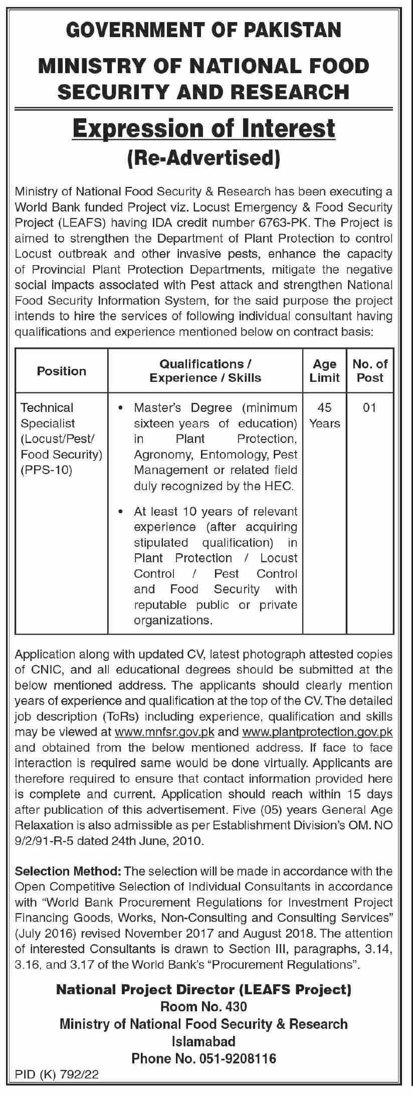 Locust Emergency & Food Security Project LEAFS, Ministry of National Food Security & Research MNFSR jobs advertisement dated about 29 September 2022 in daily Dawn Newspaper invites application for the vacant post of technical specialist food security, technical specialist low cost and technical specialist in Islamabad, islamabad Islamabad Pakistan. Candidates with Master etc. educational background will be preferred.