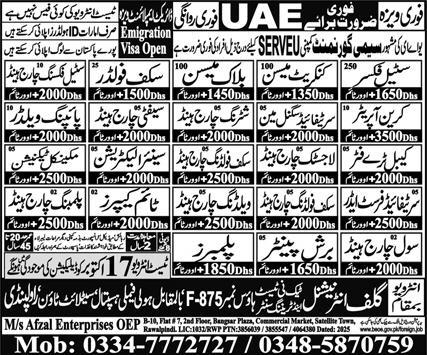 Gulf International jobs advertisement dated about 14 October 2025 in daily Express Newspaper invites application for the vacant post of first aider, block mason, crane operator, steel fixer, steel fixing chargehand, time keeper, safety chargehand, cable tray fitter, shuttering chargehand, mobile crane operator, scaffolder, welding chargehand, concrete mason, electrician, brush painter, plumber, logistic chargehand, plumbing chargehand, scaffolding chargehand, mechanical technician, piping welder, civil chargehand and signal man in Abu Dhabi, dubai UAE. Educational qualifications required Others, DAE, Bachelor, Matric and Intermediate etc.