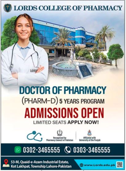 Admissions in Lords College of Pharmacy 2023 for Pharm D has been announced. Eligible students can apply for academic admissions 2023 in Lords College of Pharmacy Lahore Punjab Pakistan for Medical Medical College. Students for admissions in Pharm D can apply for online or campus classes as per Private institute criteria till admission closing date December 5, 2023. Read newspaper ad for exact details.