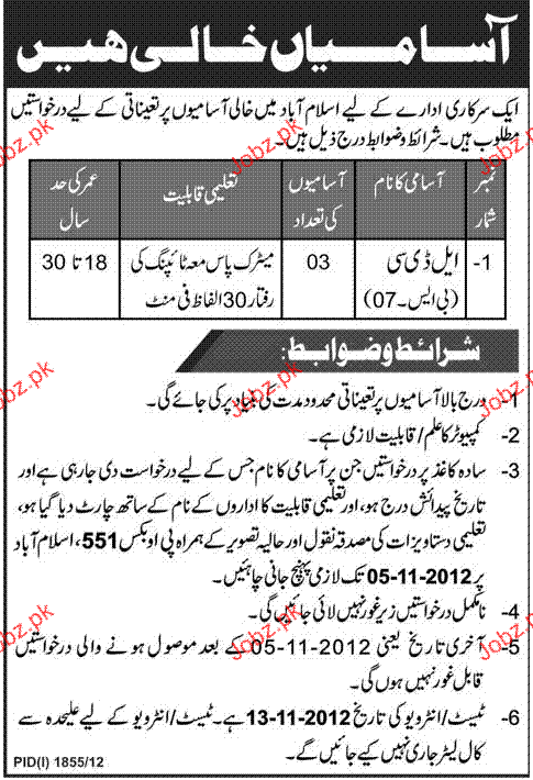 Latest Government Department Admin Clerical Posts Islamabad 2025