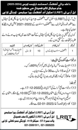 LRBT Hospital Anthalmech Assistant Diploma Course 2 Years. admissions 2022 has been started. Eligible students who qualify as per admission criteria in LRBT Hospital Karachi Sindh Pakistan can apply in Medical Diploma for academic year 2022. Students for admissions in Diploma can apply for online or campus classes as per Private institute criteria till admission closing date December 12, 2022. Read newspaper ad for exact details.