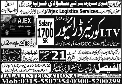 Vacant posts including ltv courier driver are announced in Talal International Overseas Employment Promoters Riyadh, riyadh Saudi Arabia as per 20 September 2024 advertisement in daily Express Newspaper. Middle etc. educational qualification will be preferred.
