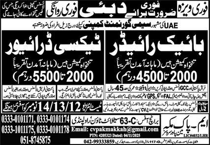 M Pak Makkah Manpower Services is looking for candidates for following posts as per job advertisement published in daily Express Newspaper of November 11, 2025 for location Dubai, abu dhabi Dubai: