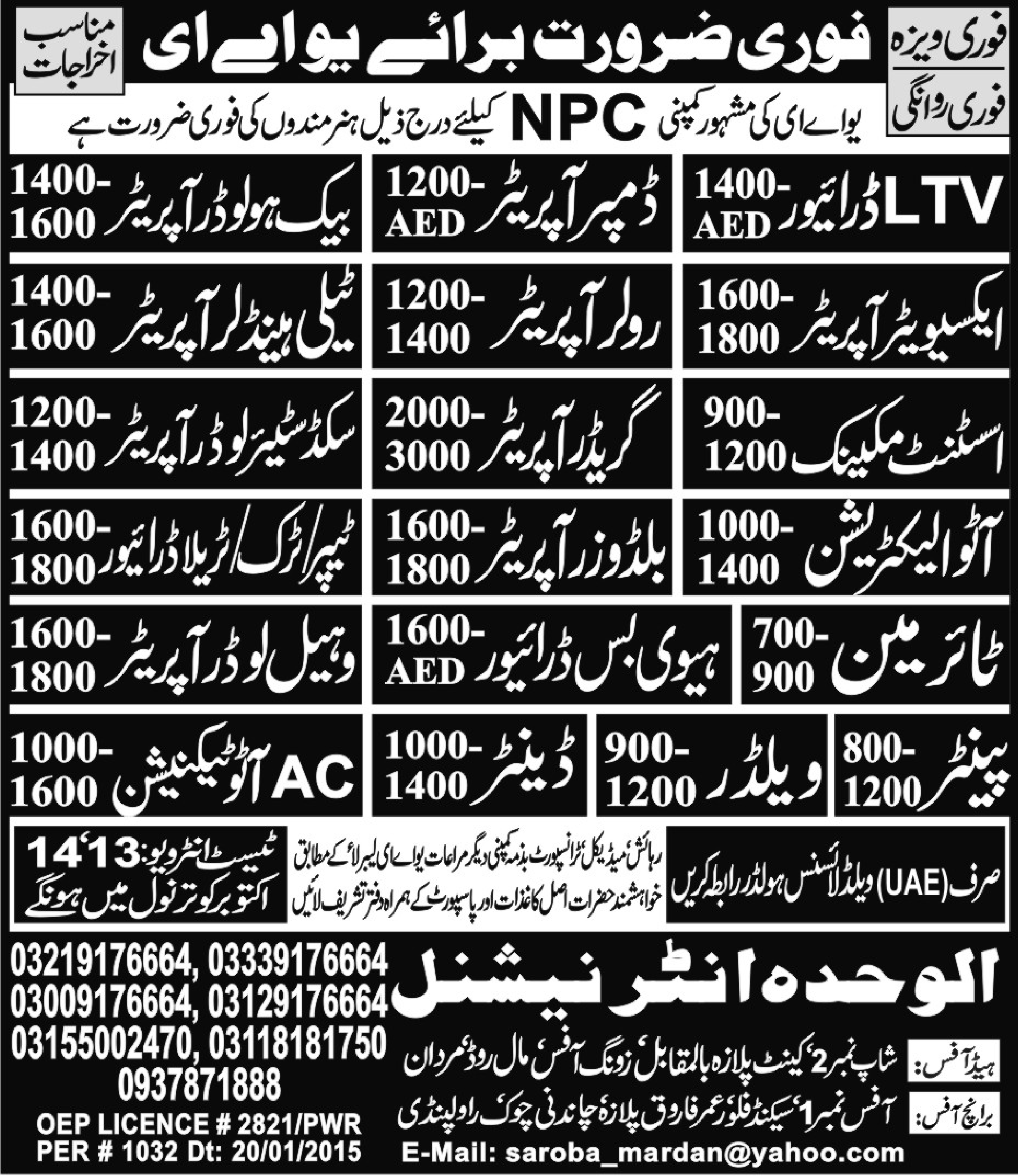 LTV Drivers, Dumper Drivers, Tyreman, Assistant Mechanics, Roler Operators, Tralla Drivers, Heavy Bus Drivers and AC Technicians are required in UAE.