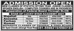 Lucky Star Academy Class 9, Class 10th, 1st Year, 2nd Year admissions 2022 has been announced. Eligible students can apply for academic admissions 2022 in Lucky Star Academy Rawalpindi Punjab Pakistan for Teaching College. Eligible candidates for admissions in Matric and Intermediate can apply as per Private institute criteria and before closing date 25 March 2022 after reading advertisement online. Read newspaper ad for exact details.