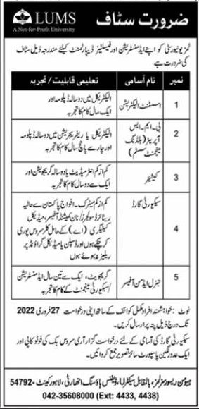 Lahore University of Management Sciences LUMS invites applications for job positions advertised in daily Nawaiwaqt dated 14 February 2022 for following vacancies in Lahore Punjab Pakistan.