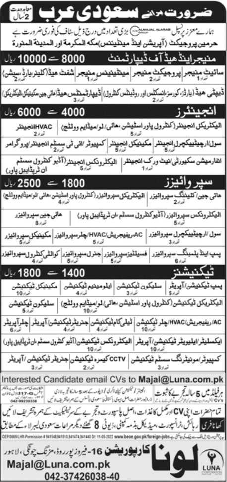 Luna Corporation invites applications for job positions advertised in daily Jang dated 15 May 2022 for following vacancies in Makkah, makkah Saudi Arabia.
