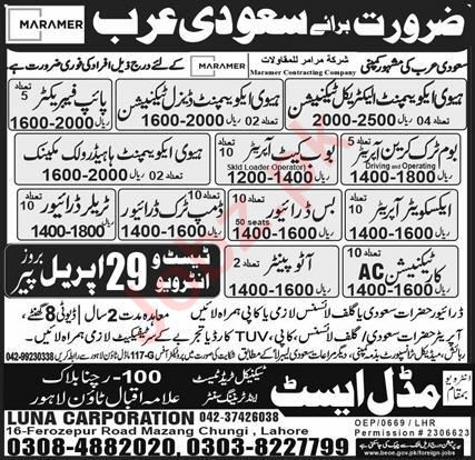 Luna Corporation Riyadh, riyadh Saudi Arabia invites applications from eligible candidates for the post of heavy equipment diesel technician, excavator operator, bob cut operator, heavy equipment hydraulic mechanic, bus driver, auto painter, dump truck driver, pipe fabricator, trailer driver, heavy equipment electrical technician, bomb truck crane operator and car ac technician as per advertisement of April 29, 2024 published in daily Express Newspaper. Preferred Education is Matric, Intermediate and Middle etc.