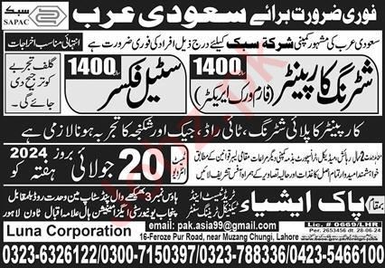 Luna Corporation Riyadh, riyadh Saudi Arabia invites applications from eligible candidates for the post of shuttering carpenter and steel fixer as per advertisement of July 15, 2024 published in daily Express Newspaper. Middle, Matric and Primary etc. educational qualification will be preferred.