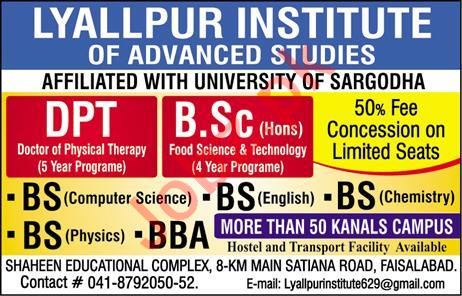 Lyallpur Institute of Advanced Studies has announced admissions in Doctor of Physical Therapy DPT, B.Sc Food Science and Technology, BS Computer Science, BS English, BS Chemistry, BS Physics, BBA in Faisalabad. Read newspaper ad for exact details.