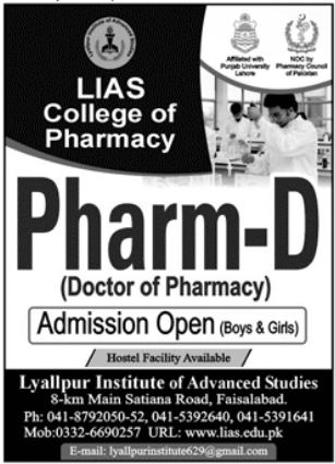 Lyallpur Institute of Advanced Studies LIAS Faisalabad has announced to offer admissions in Pharm D Program. The eligible and interested candidates can now apply for Pharm D Admission. Read newspaper ad for exact details.