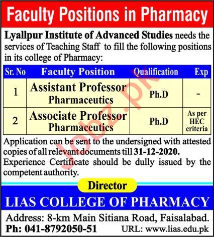 Vacancies in Lyallpur Institute Of Advanced Studies Advertisement December 2020