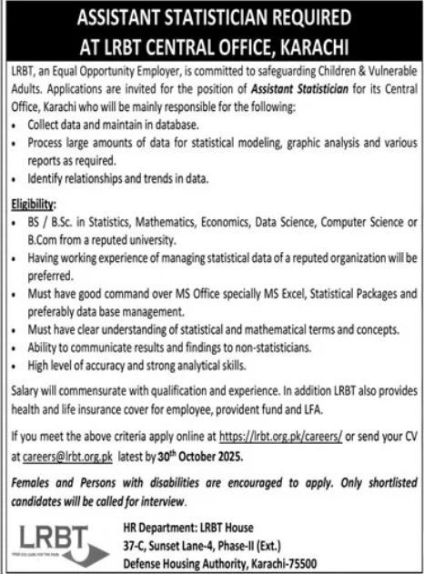 Lyton Rahmatullah Benevolent Trust LRBT is looking for candidates for following posts as per job advertisement published in daily Jang Newspaper of October 26, 2025 for location Karachi, karachi Sindh Pakistan:
