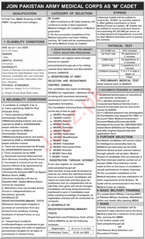 Vacant posts including m cadet are announced in Pakistan Army Rawalpindi, dera ismail khan, peshawar, lahore, karachi, rawalpindi, faisalabad, pano aqil and khuzdar Punjab Pakistan as per 1 June 2025 advertisement in daily Jang Newspaper. Educational qualifications required MBBS etc.