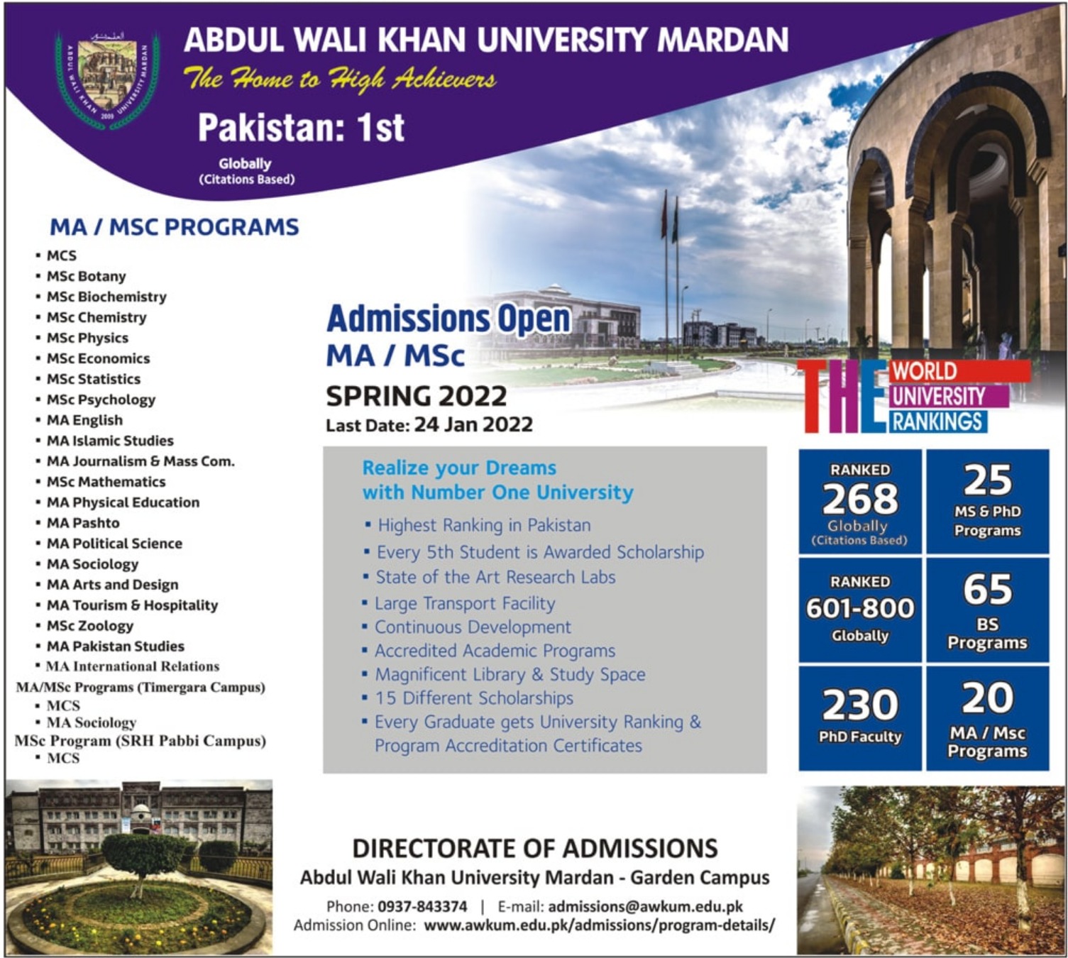 MA and MSc Programs admissions at Abdul Wali Khan University