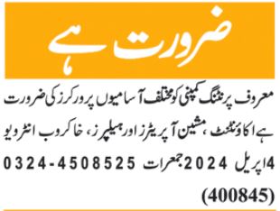Printing Company invites applications for job positions advertised in daily Nawaiwaqt dated 3 April 2024 for following vacancies in Lahore, lahore Punjab Pakistan.