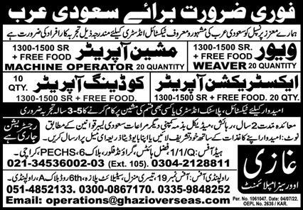 Ghazi Overseas Employment invites applications for job positions advertised in daily Express dated 18 July 2022 for following vacancies in Riyadh, dammam Saudi Arabia.
