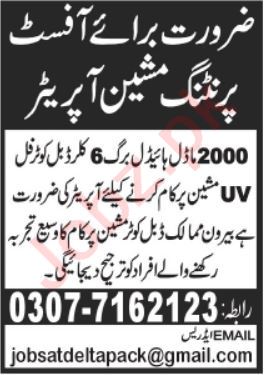 Private Company jobs advertisement dated about 13 November 2022 in daily Jang Newspaper invites application for the vacant post of machine operator and printing machine operator in Lahore, lahore Punjab Pakistan. Matric, Middle and Primary etc. educational qualification will be preferred.