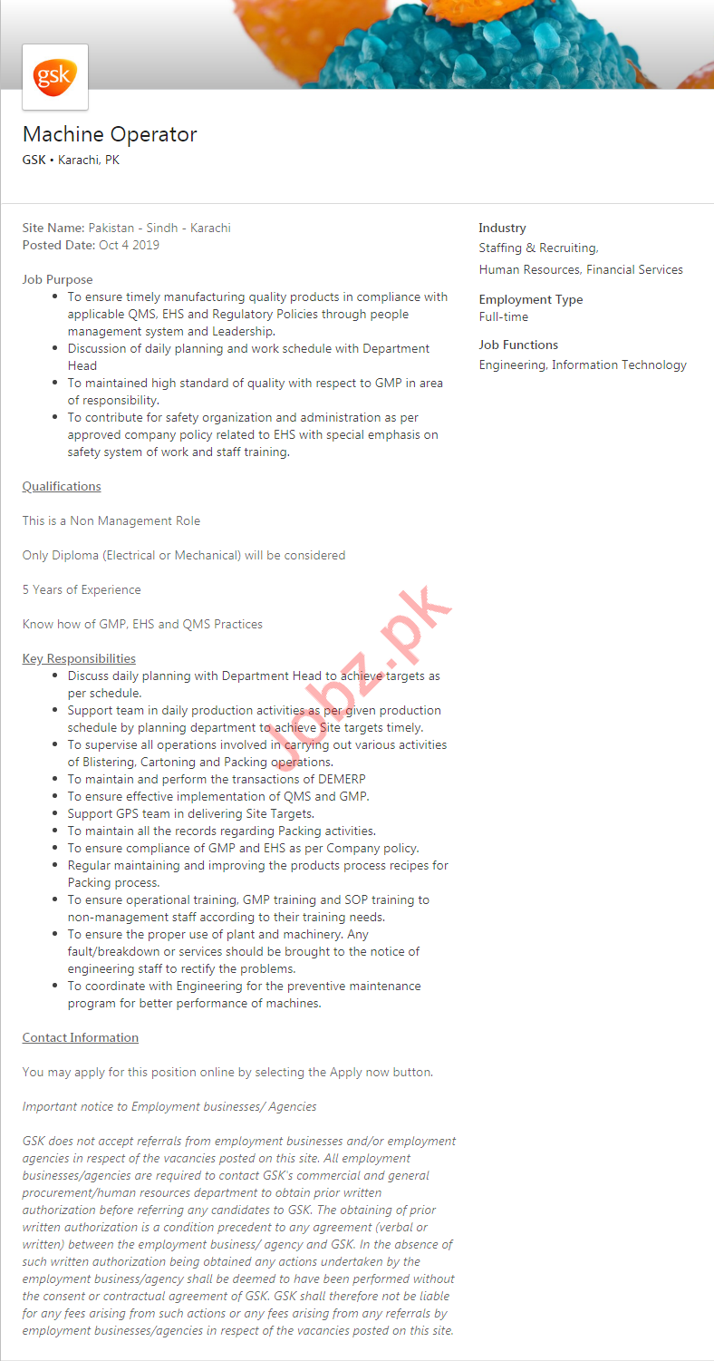 Vacancies in GSK Pharmaceutical Company Advertisement October 2019