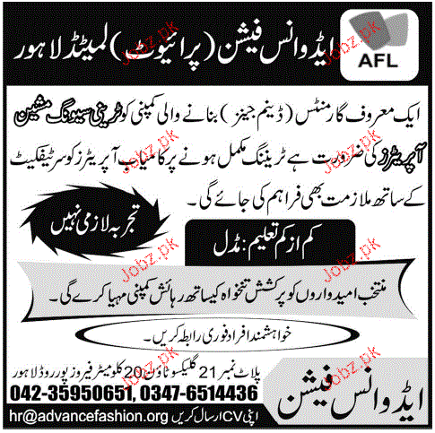 Machine Operators are required in Advance Fashion Pvt Ltd in Lahore.