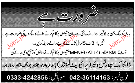 Machine Operators are required in Dynamic Sports Ware Pvt Ltd in Lahore