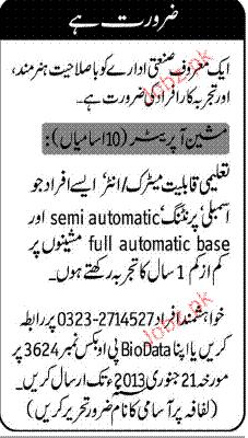 Machine Operators are required in Karachi