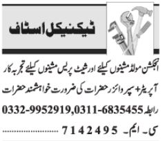 Factory Lahore, lahore Punjab Pakistan invites applications from eligible candidates for the post of injection molding operator, supervisor, machine press operator and sheet machine press operator as per advertisement of January 27, 2024 published in daily Jang Newspaper. Candidates with Intermediate, Matric and DAE etc. educational background will be preferred.