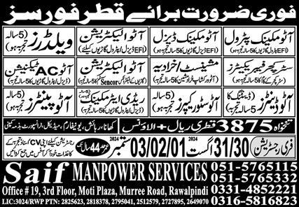 Saif Manpower Services jobs advertisement dated about 31 August 2024 in daily Express Newspaper invites application for the vacant post of lathe machine operator, auto storekeeper, auto electrician, machinist, auto mechanic diesel, radiator mechanic, auto mechanic petrol, welder, auto painter, structure fabricator, auto denter and auto ac technician in Doha, doha Qatar. Candidates with Matric, DAE, Bachelor and Intermediate etc. educational background will be preferred.