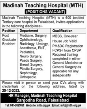 Madinah Teaching Hospital Faisalabad, faisalabad Punjab Pakistan invites applications from eligible candidates for the post of post graduate resident in paeds surgery, post graduate resident in paeds, post graduate resident in breast surgery, post graduate resident in anesthesia, post graduate resident in urology, post graduate resident in ophthalmology, post graduate resident in nephrology, post graduate resident in pediatrics, post graduate resident in medicine, post graduate resident in radiology, post graduate resident in plastic surgery, post graduate resident in surgery, post graduate resident in orthopedic, post graduate resident in ent, post graduate resident in neurosurgery and post graduate resident as per advertisement of December 10, 2023 published in daily Roznama 92 News Newspaper. Preferred Education is P.G Diploma, MBBS and Others etc.