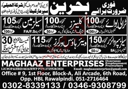 Maghaaz Enterprises jobs advertisement dated about 29 July 2024 in daily Express Newspaper invites application for the vacant post of sale supervisor, cleaner, ware house worker, salesman and trolley boy in Bahrain, bahrain Bahrain. Educational qualifications required Primary, Matric, Middle and Intermediate etc.