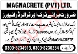 Vacant posts including trailer driver and truck driver are announced in Magnacrete Pvt Limited Karachi, karachi Sindh Pakistan as per 17 November 2024 advertisement in daily The News Newspaper. Educational qualifications required Middle, Matric and Primary etc.