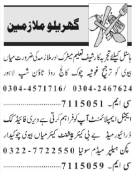 House jobs advertisement dated about 22 March 2022 in daily Jang Newspaper invites application for the vacant post of driver, chef, patient care, maid, chowkidar and baby care in Lahore, lahore Punjab Pakistan. Persons with Middle and Primary etc. education can apply.