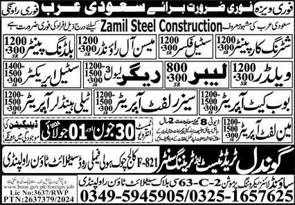 Vacant posts including labor, building painter, bobcat operator, telehandler operator, scissor lift operator, steel fixer, welder, main lift operator, shuttering carpenter, rigger, steel erector and mason are announced in Gondal Trade Test & Training Center Dammam, jeddah Saudi Arabia as per 27 June 2024 advertisement in daily Express Newspaper. Educational qualifications required Middle, Intermediate and Matric etc.