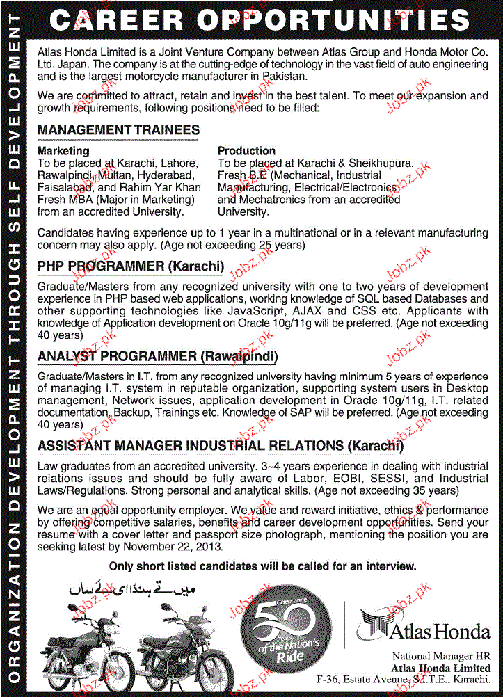 Apply as per details in job advertisement. Login to view further details of how to apply via https://www.jobz.pk online.