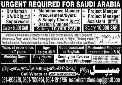 Maple International Overseas Employment Promoters invites applications for job positions advertised in daily Express dated 18 May 2024 for following vacancies in Dammam, riyadh Saudi Arabia.