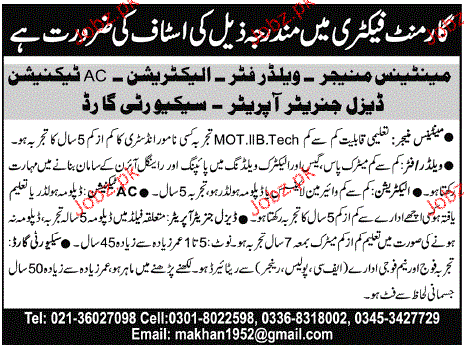 Maintenance Manager, Welder Fitters, Electricians Wanted