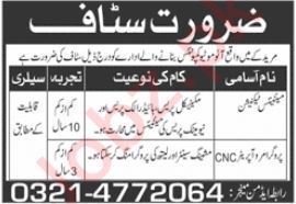 Private Company Lahore, lahore Punjab Pakistan invites applications from eligible candidates for the post of maintenance technician and programmer operator cnc as per advertisement of July 7, 2024 published in daily Jang Newspaper. Persons with DAE and Matric etc. education can apply.