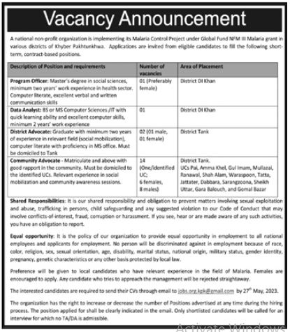 Vacant posts including program officer, district advocate, data analyst and community advocate are announced in Malaria Control Project Dera Ismail Khan, dera ismail khan Khyber Pakhtunkhwa KPK Pakistan as per 15 May 2023 advertisement in daily Mashriq Newspaper. Persons with Master, MS and Bachelor etc. education can apply.