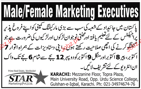 Male / Female Marketing Executives are required in Star Marketing Pvt Ltd in Karachi