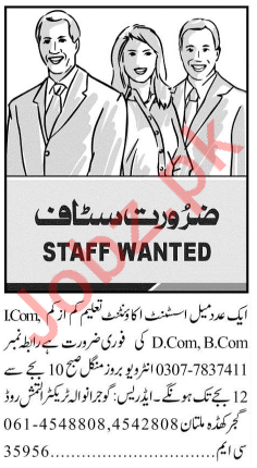 Apply as per details in job advertisement. Login to view further details of how to apply via https://www.jobz.pk online.